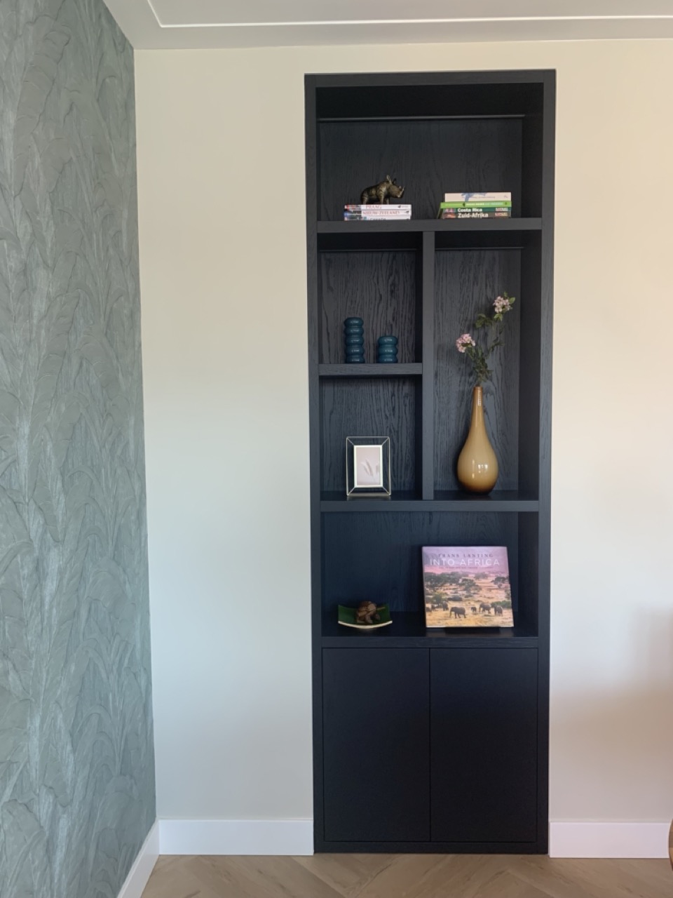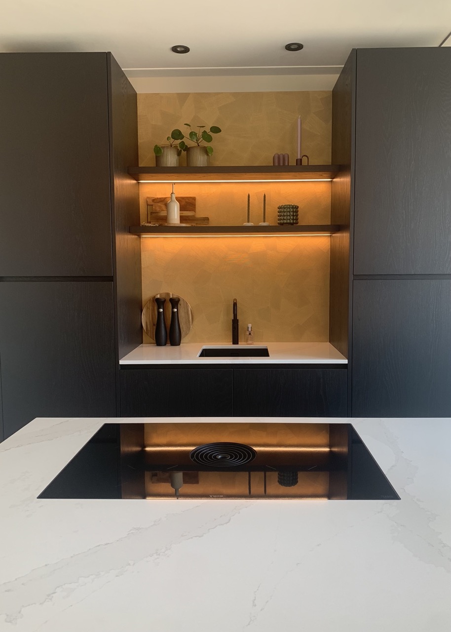 De eigenaresse van dit appartement wenste een keukeneiland, maar verwachtte niet dat dit ook werkelijkheid kon worden. Door slimme aanpassingen met kasten in wanden, wegwerken van muren en veranderingen van draairichtingen van deuren, kon het droombeeld uitgevoerd worden. Een plaatje!